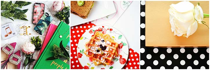 If you have a careful look at the pictures above you'll see there's a variety of backgrounds, from plain to textured with wood, marble or even glass (in the workspace collage). Neutrals backgrounds like these are always the best bet to add that little something that's so important because it holds the entire picture together. You'll wanna make sure your background is not overpowering but if you'd like to choose a bright, fun background, go to the next point..which is...